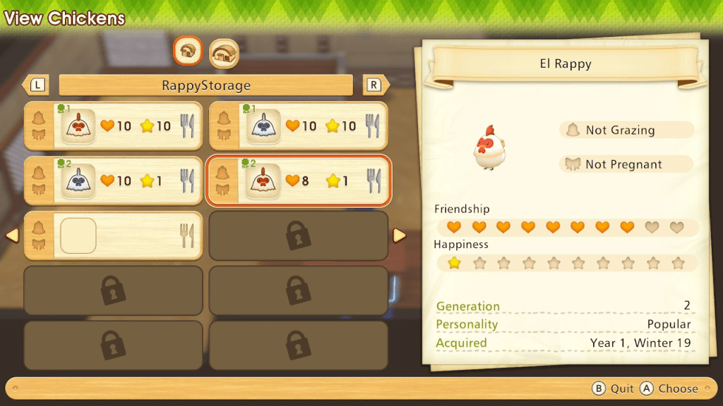 Moving on to animals, the generation-based progression from Story of Seasons: Friends of Mineral Town makes a come back. Until you can breed your animals, they won’t produce more than a preset star level of byproduct. You’ll need to build a larger barn/coop before you can really get into breeding, but for the ranching enthusiasts, there’s plenty of room for a large amount of facilities full of animals and space to graze. Naturally, as Makers originally appeared in the series to make products like cloth, yarn, yogurt, and so on, those will also factor into ranching and allow you to cook new recipes or commission new outfits and accessories in town.